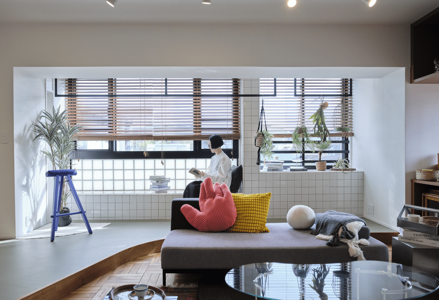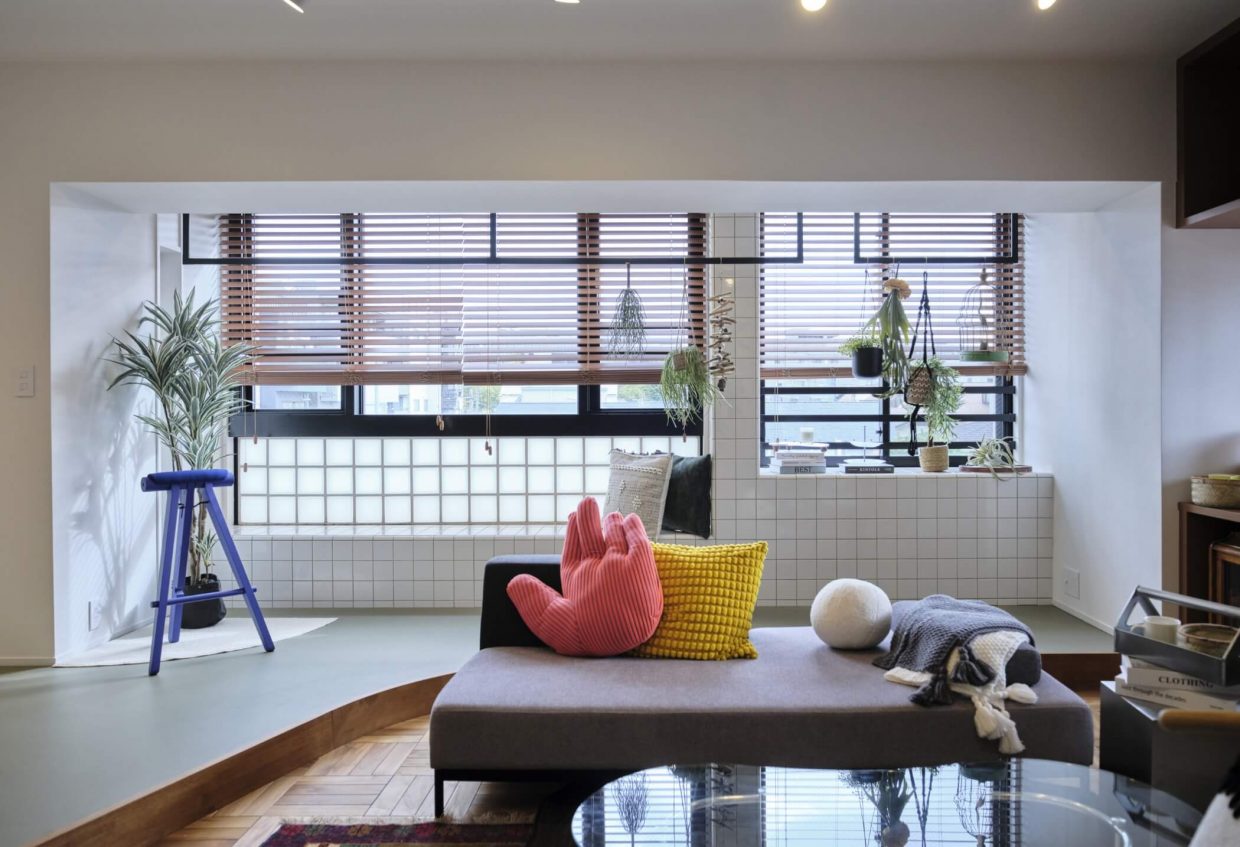 大きな横長窓につながる窓台には、多治見のデッドストックタイルを使いました。光を通すガラスブロックが印象的なもともとの壁とつながりつつ、クリーンなキャンバスのような印象をもたらします。