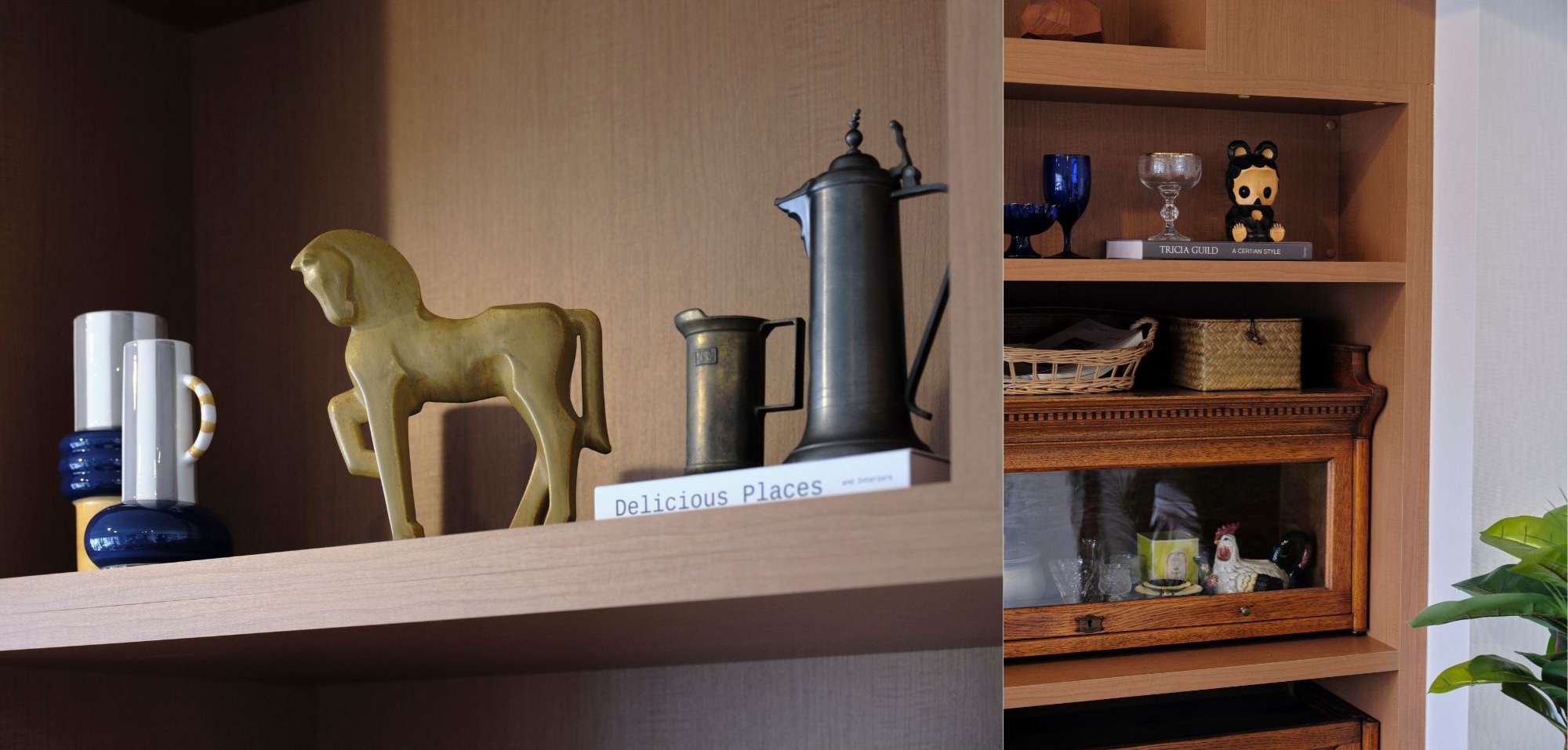 リビングは、いわば部屋の中心地。玄関から廊下を抜けると大きく広がるリビングは、部屋の印象を大きく左右します。もともとの窓は生かしつつ、壁全面の飾り棚にはヨーロッパのアンティーク什器を埋め込んで、一つの空間に多層的な表情を持たせています。中央の棚のサイズは、テレビ台やアートパネルが置けるようなゆとりのあるサイズに。季節や気分にあわせて、ディスプレイを楽しめます。